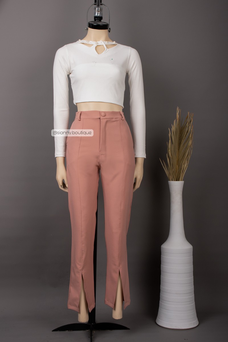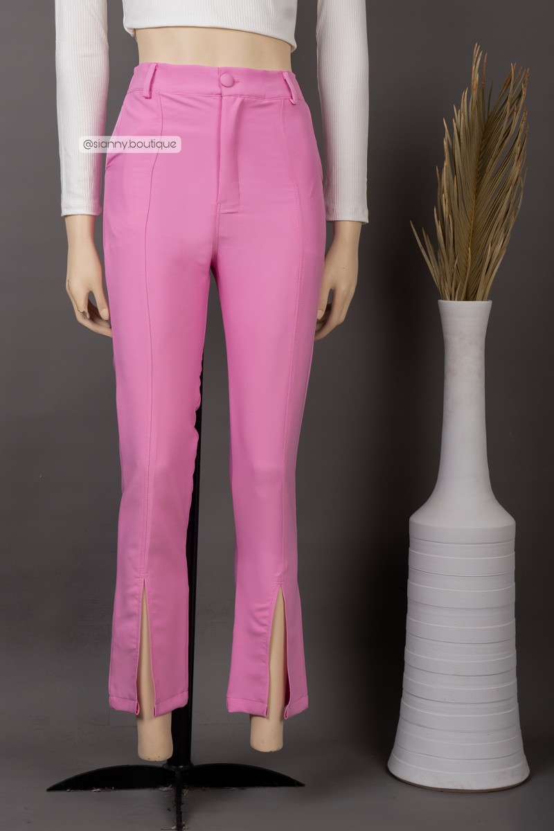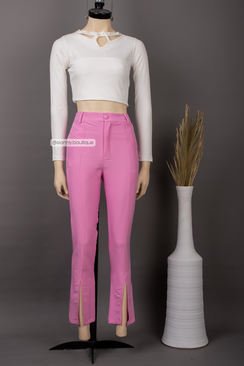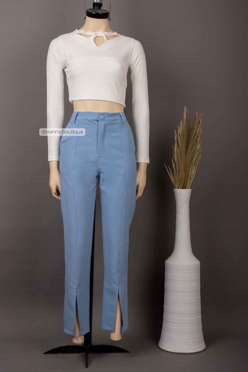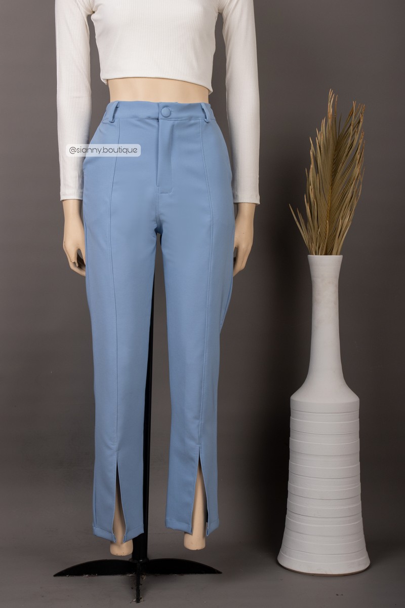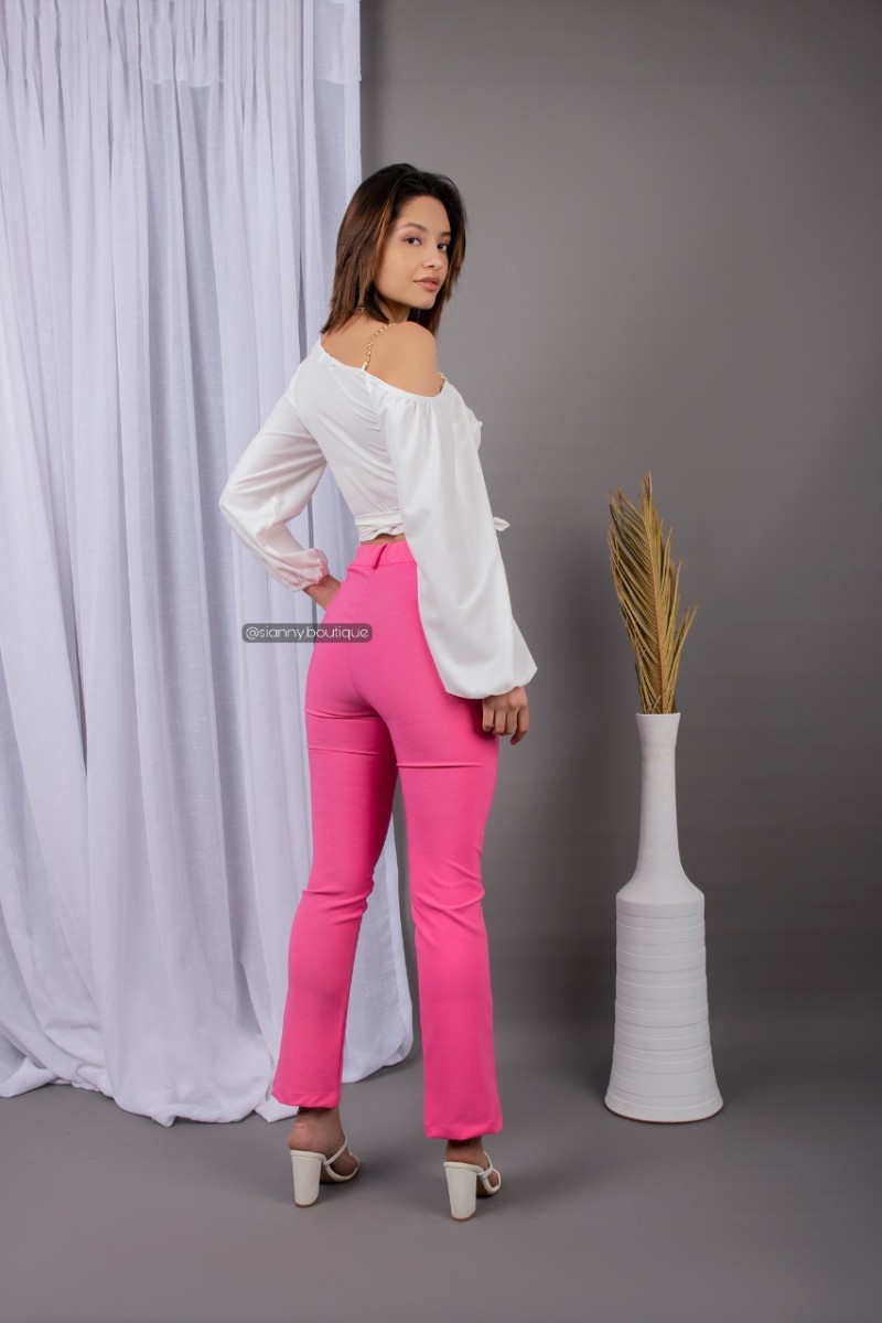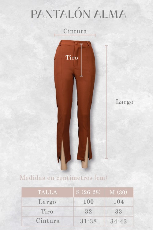 - Pantalón de tiro alto con pinzas en la parte posterior y elastico en la cintura para mejor entalle.