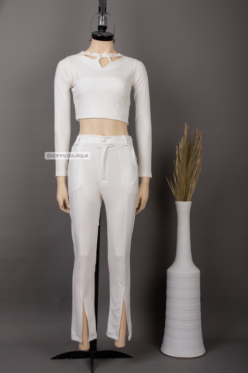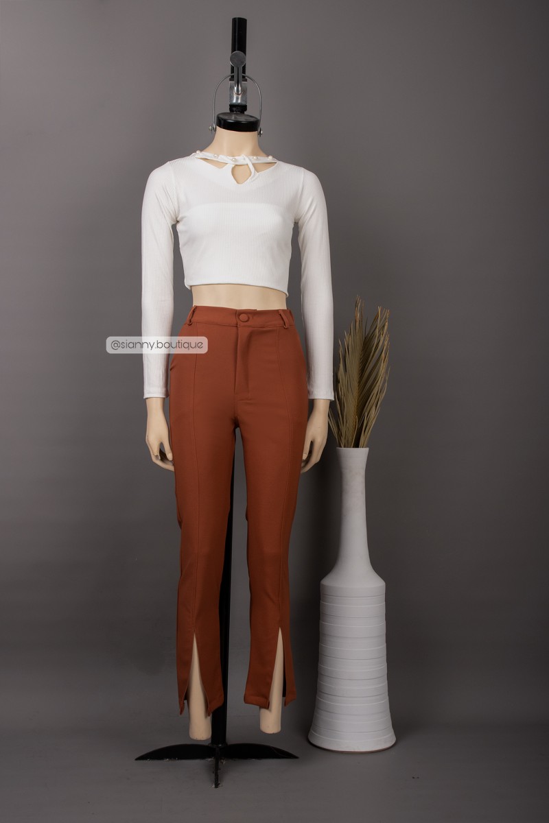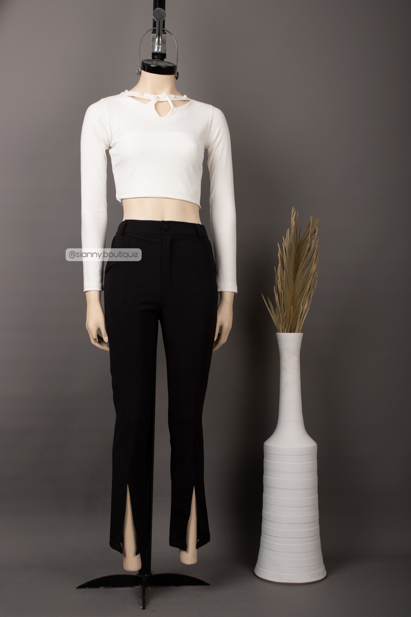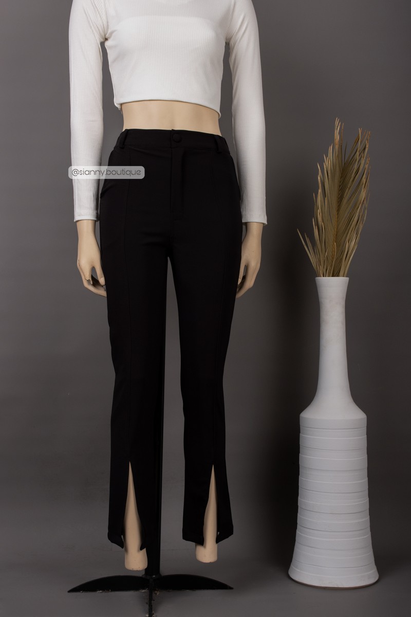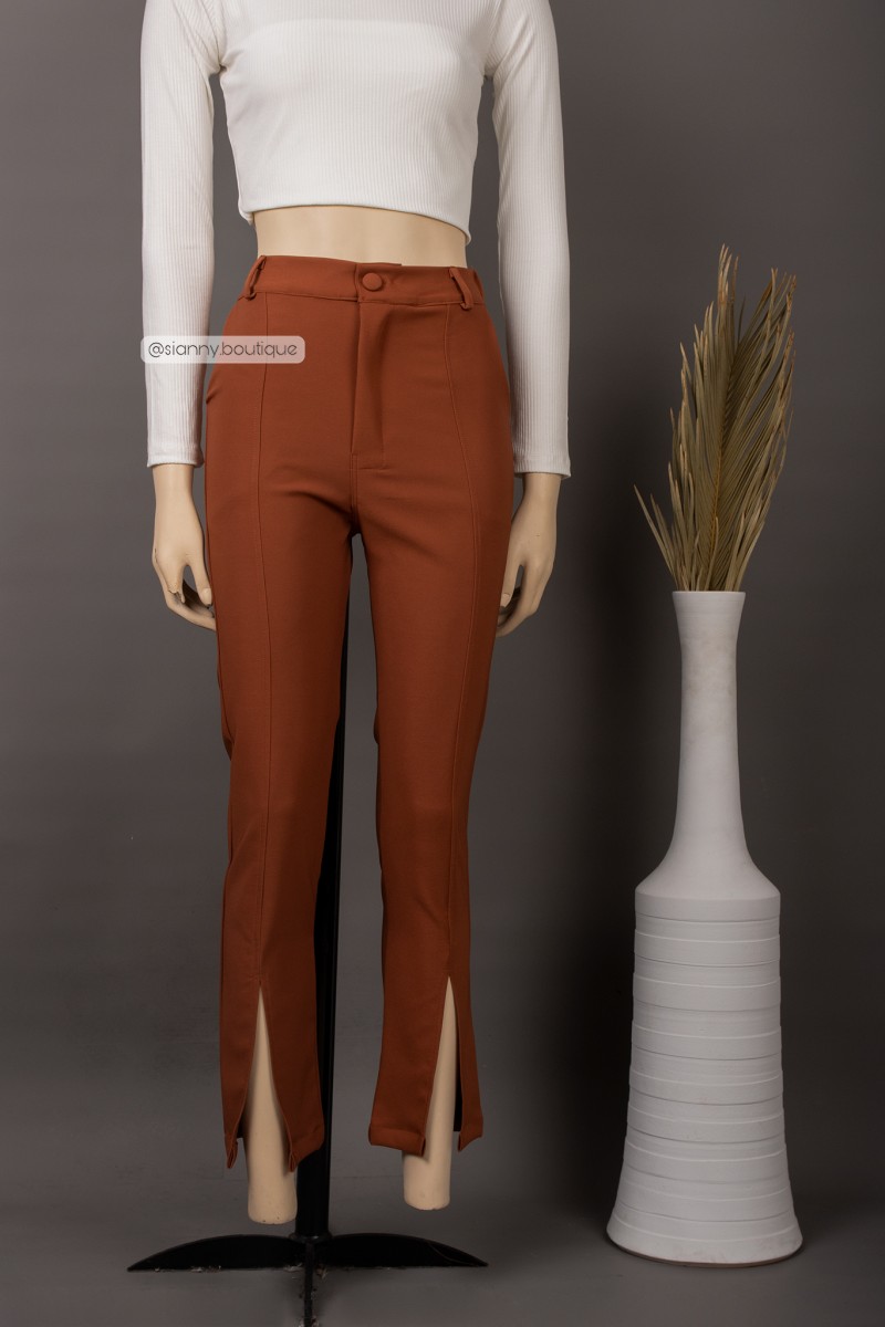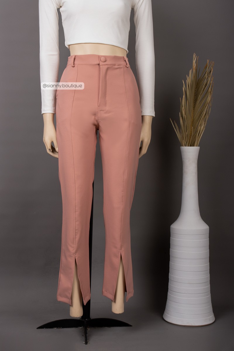 - Pantalón de tiro alto con pinzas en la parte posterior y elastico en la cintura para mejor entalle.